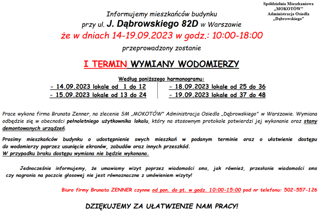 Ogłoszenie – J. Dąbrowskiego 82D – Korekta Telefonów Kontaktowych. Wymiana Wodomierzy w Dniu 14-19.09.2023 r. w godz. 10:00 – 18:00.
