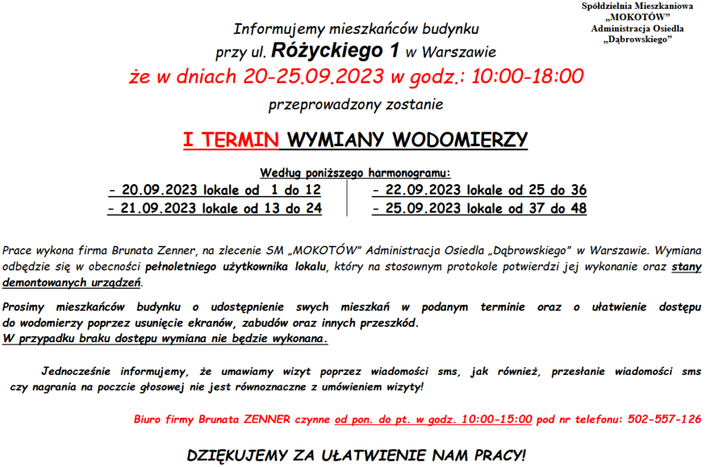 Ogłoszenie – Różyckiego 1 – Korekta Telefonów Kontaktowych. Wymiana Wodomierzy w Dniu 20-25.09.2023 r. w godz. 10:00 – 18:00.