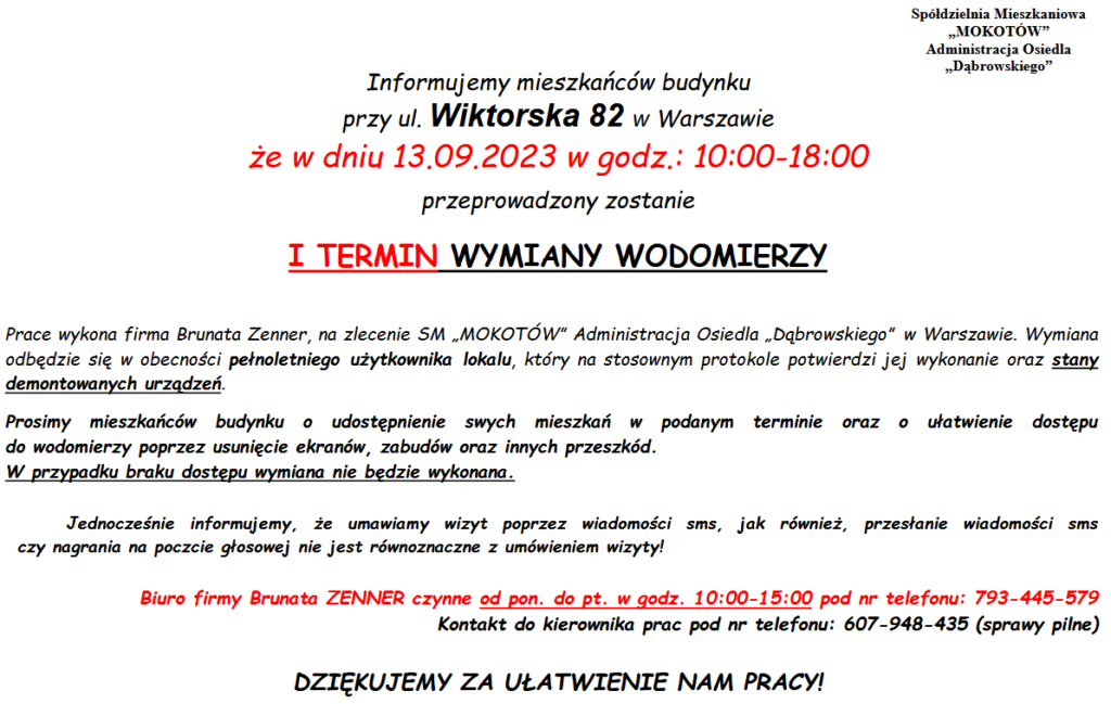 Ogłoszenie – Wiktorska 82 – Korekta Telefonów Kontaktowych. Wymiana Wodomierzy w Dniu 13.09.2023 r. w godz. 10:00 – 18:00.